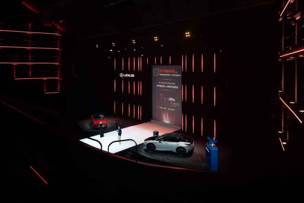 Lors d’un événement d’envergure, comme la convention annuelle Lexus au Palais des Festivals de Cannes, chaque minute d’attention compte. Le défi pour la marque ? Parler de performance, de chiffres et d’avis clients (e-réputation) sans « plomber » l’ambiance, mais en marquant les esprits.